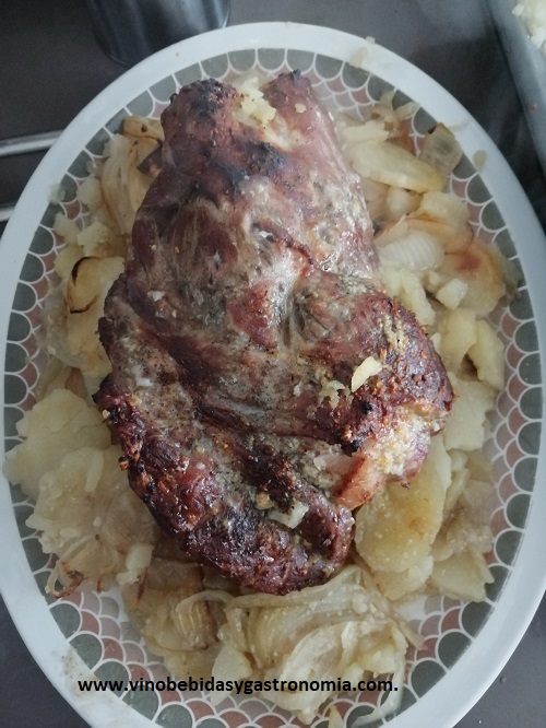 Preparation: First, peel and crush the garlic cloves in a mortar with a little salt. Season the meat and add the crushed garlic to the entire skin of the meat so that it is well filled with garlic. Peel the potatoes and onions and cut the potatoes into thin slices and the onions into julienne strips. We put the potatoes in a bowl with water to wash them. Drain them well and add a base of potatoes and onion in the oven tray. Then we put the meat on that base. Add the oil, brandy and wine. Next we place the tray in the oven (we do this because the tray weights a lot) and add half a liter of water. Bake at 180 ºC for about 90 minutes, adding occasionally to the meat the broth we have made with water, wine and brandy. When the meat is done, we take out the oven and serve a base of potatoes and onion and the meat on top with the photo and ready to eat !!!!!