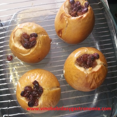 Preparation: Preheat the oven to 150 ºC. Wash the apples and remove the core. Put them on a oven plate. Melt a little butter and add the sugar and cinnamon powder. Add that mixture inside the apple. Add the sultanas raisins in the hole made previously as shown in the photo. Add water and a glass of rum to the oven plate with the apples. Bake at that temperature for about 40 minutes until you see they are done. Serve in a platter and ready to eat !!!!
