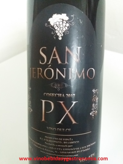 Vino Dulce PX San Jerónimo Cosecha 2017. Cooperativa San Jerónimo. DO Montilla-Moriles. Uva: Pedro Ximénez. Notas de cata: Color caoba oscuro con reflejos dorados. En nariz tiene intensidad alta con notas características de este tipo de vino (pasas, higos, dátiles, café) y también encontramos aromas a cítricos sobre todo a piel de naranja. En boca es equilibrado en la cual encontramos las mismas características que encontramos en nariz (pasas, higos, dátiles, café) pero encontramos sabores a vainilla que en nariz me cuesta detectar. Final muy largo. Maridaje: Postres (helados, pasteles y fruta como las fresas).