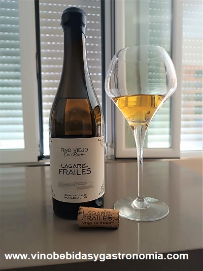 Vino fino viejo en Rama 15 años Lagar de los Frailes . Bodega Lagar de los Frailes. Uva: 100% Pedro Ximenez. Notas de cata: Color: Color dorado medio con reflejos de dorado mas oscuro. En nariz lo primero que vamos a encontrar a copa parada es miga de pan( no levadura), fruto de esos 15 años de crianza biológica pero también de ese rociado para mantener ese velo de flor vivo. Al mover la copa encontramos notas a almendras y a críticos sobretodo a limón. En boca es un vino muy equilibrado con una entrada un poco punzante pero que después en el retrogusto es muy agradable con notas a salinidad, panadería, frutos secos y criticos. Final largo y persistente. Maridaje: Es un vino muy gastronómico que se puede maridar con embutidos, salmorejo, marisco, estofados como un estofado a la amontillana y también postres como un bizcocho de limón.